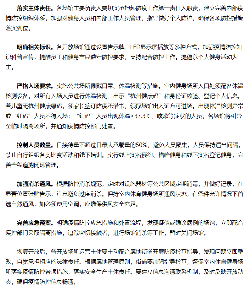 复工的体育场所在严格落实企业复工复产疫情防控工作有关规定的基础上,还应进一步做好以下工作: