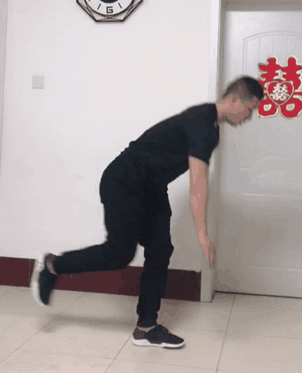 动作步骤: 腿站立准备,屈膝屈髋,身体前倾,手臂自然下垂,保持头,上背髋关节一条直线